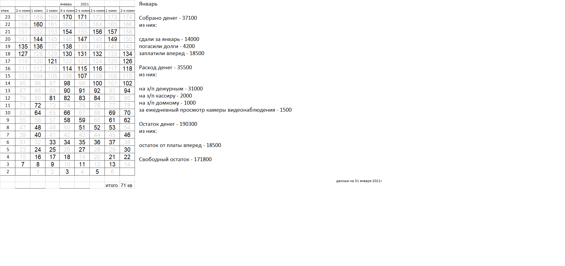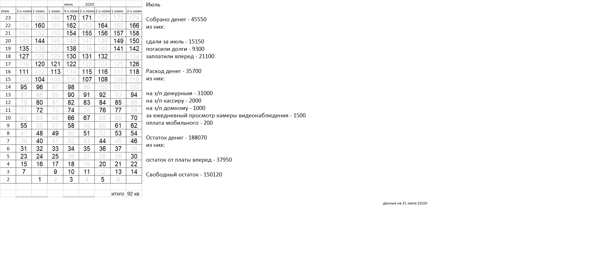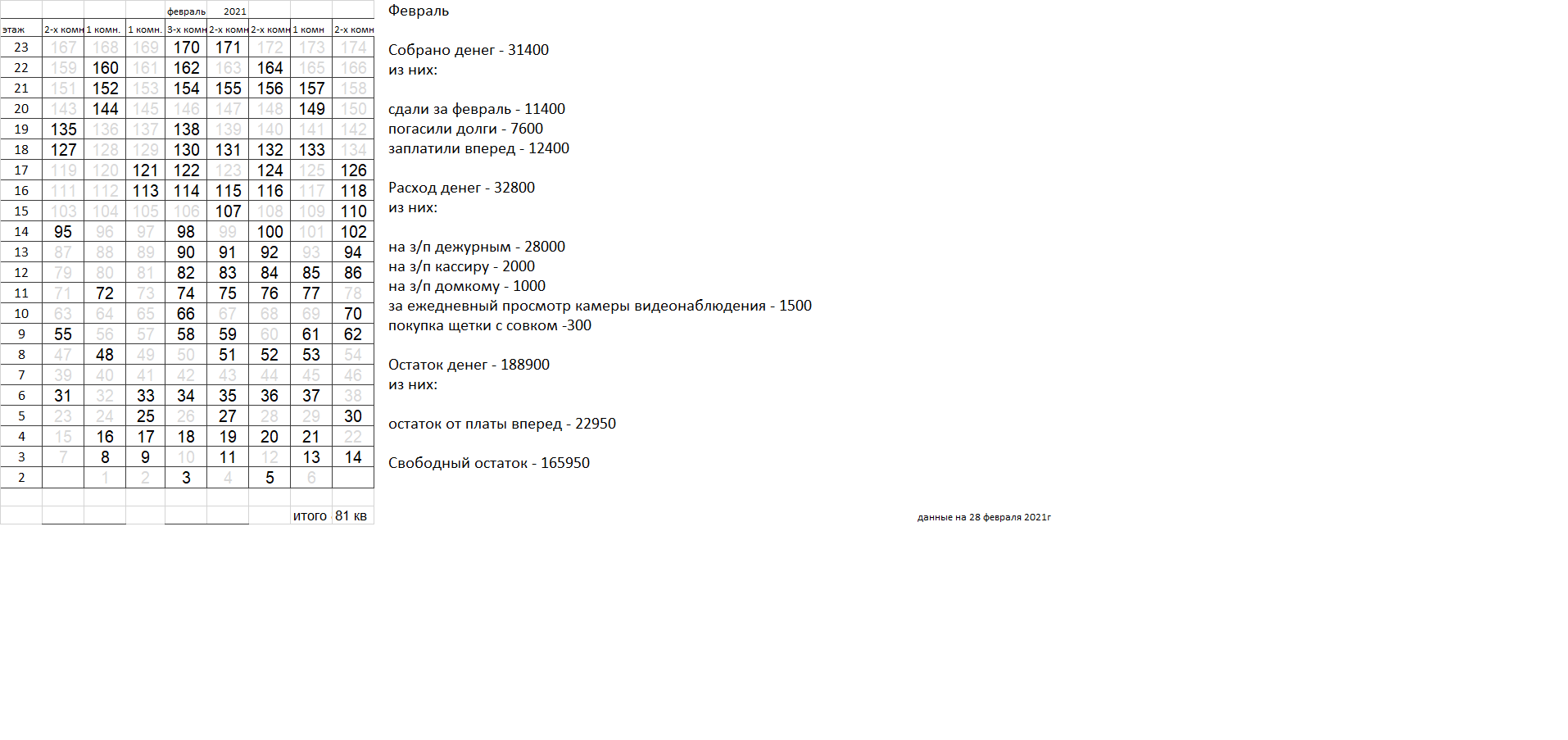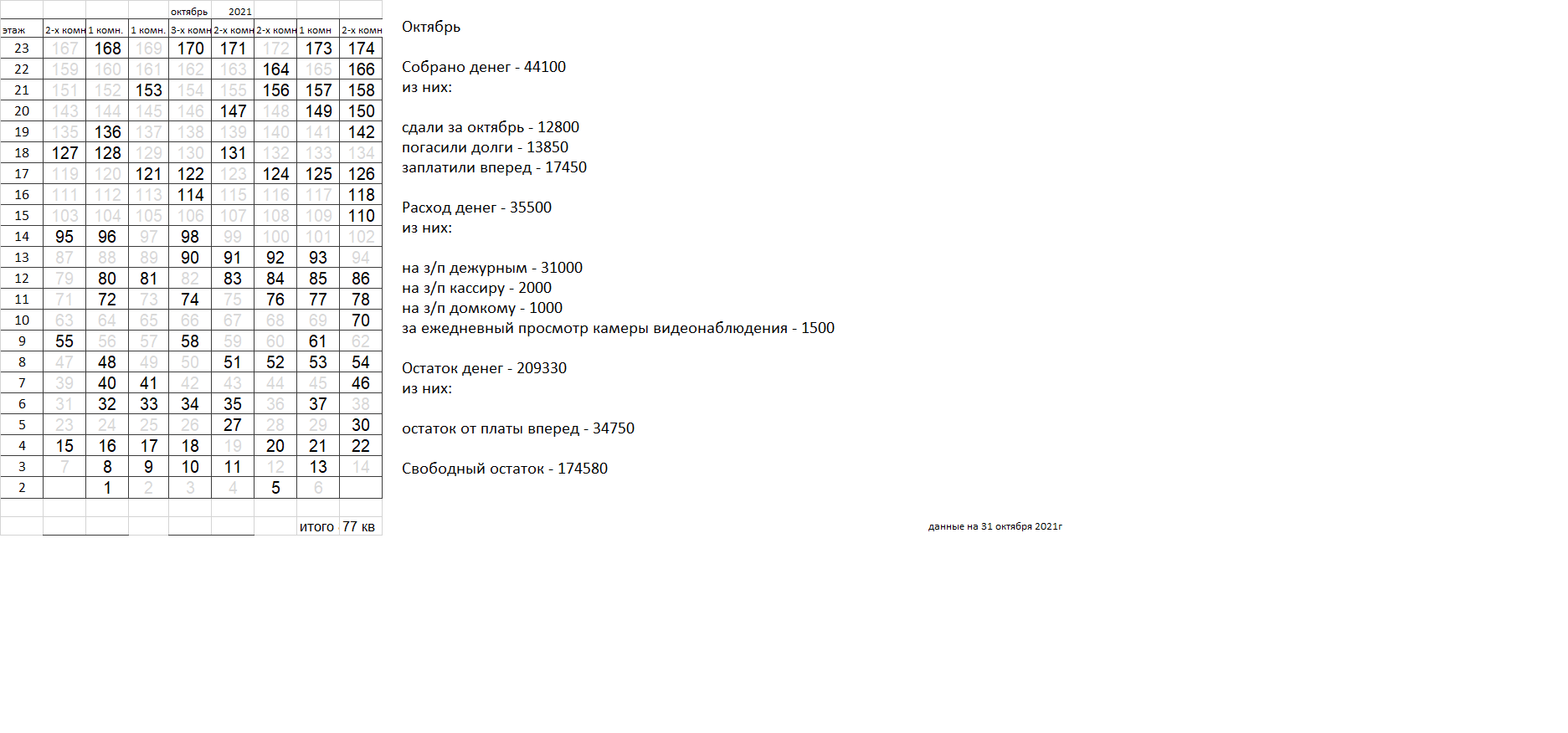 Уважаемые соседи. Сдаваемых денег катастрофически не хватает для найма вахтеров, которыми все были бы довольны. Домком пока пытается наладить службу охраны, но если в ближайшее время ситуация не улучшится, вахта будет закрыта, домком распущен. |
